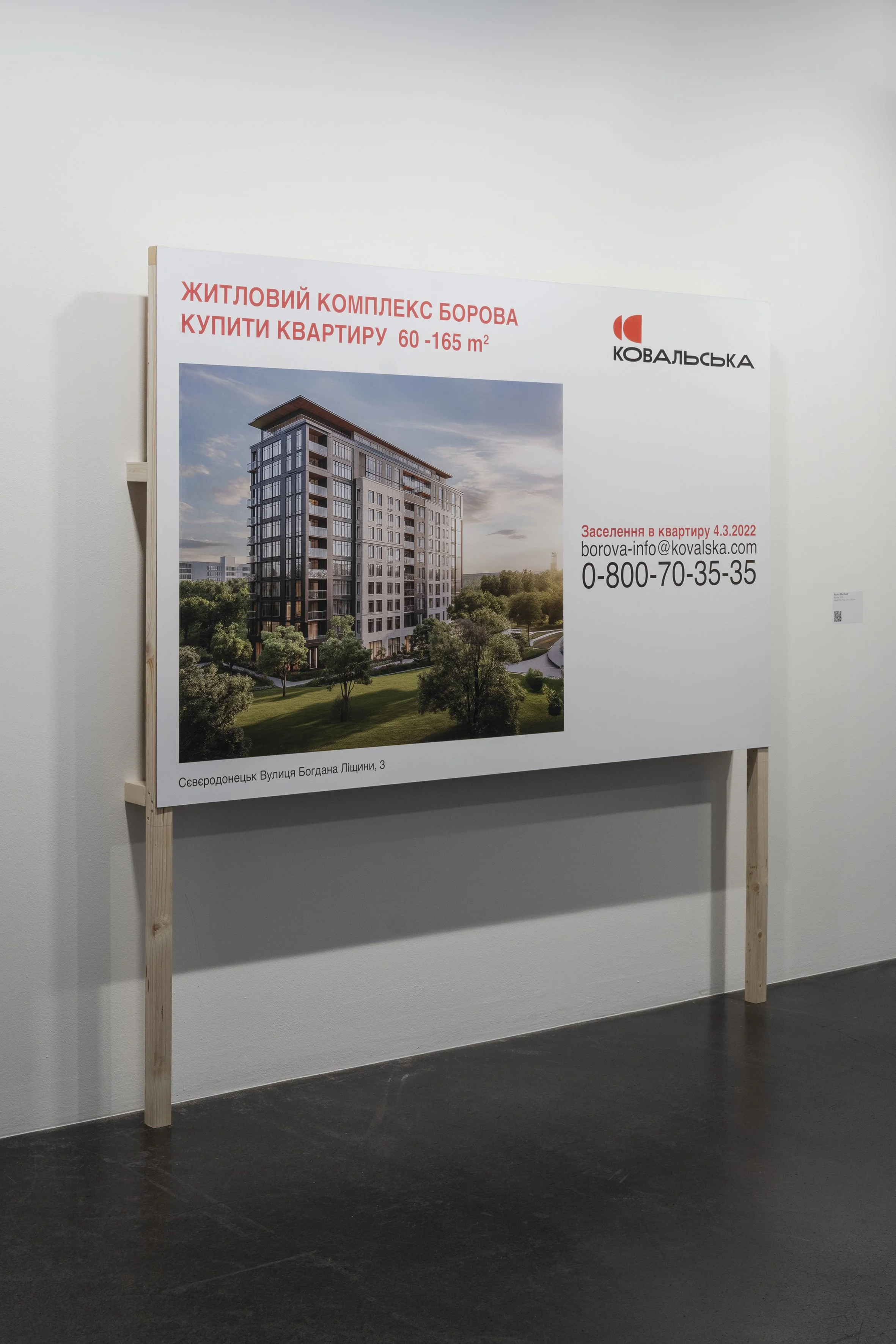 Ein Verkaufsschild, wie man es von Strassenrändern kennt, kündigt in kyrillischer Schrift einen Neubau an. Als Vorbote der Gentrifizierung verspricht die Architekturvisualisierung modernes Leben in einer grünen Oase. Die üblichen Angaben – Kontakt, Adresse und Details zu den Eigentumswohnungen – sind vermerkt. Der frühestmögliche Bezugstermin liegt bereits über drei Jahre in der Vergangenheit: der 4. März 2022, nur eine Woche nach Beginn des Ukrainekriegs.